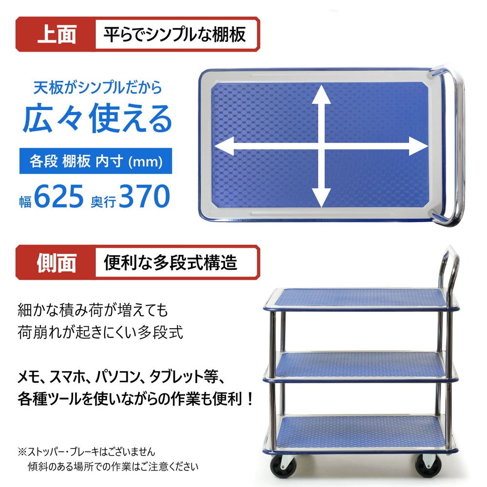 上段が作業台としても使える!便利な静音3段台車!