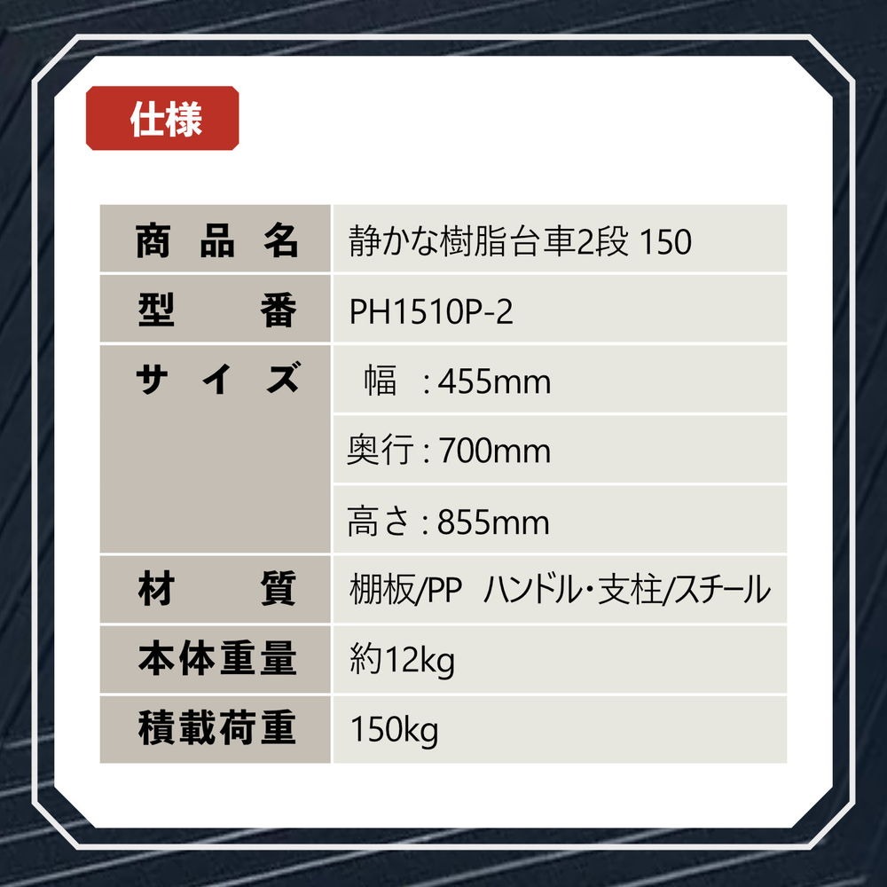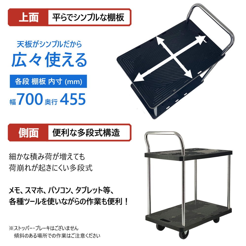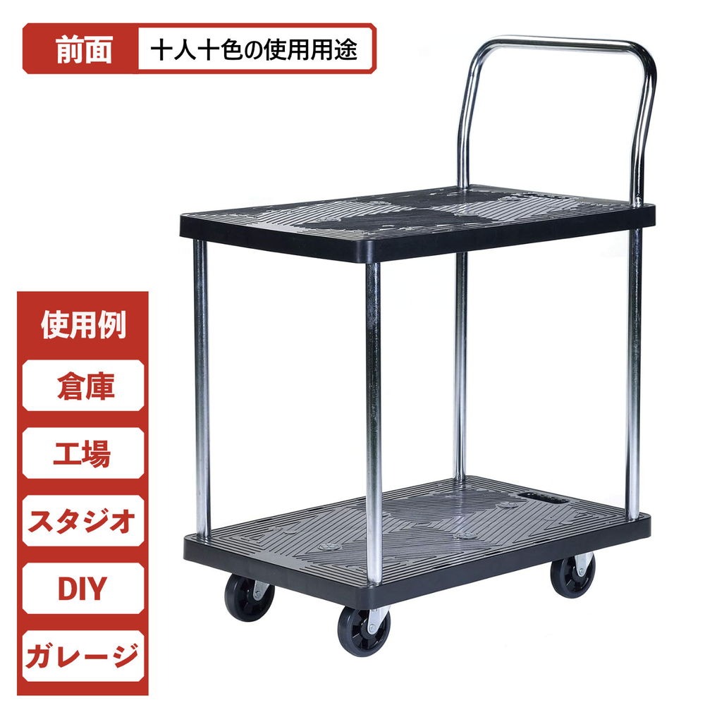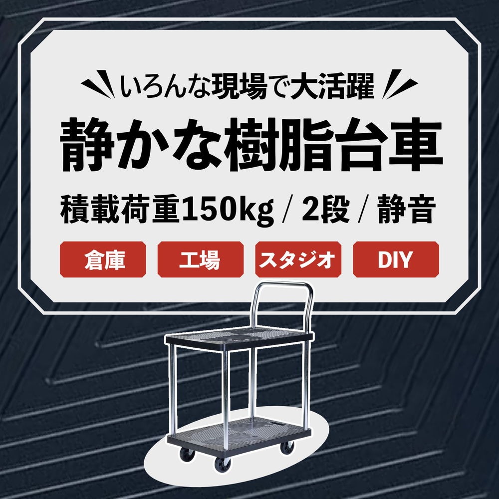 「2段式」の樹脂棚板を採用した積載荷重(耐荷重)150kgの多段式台車です。