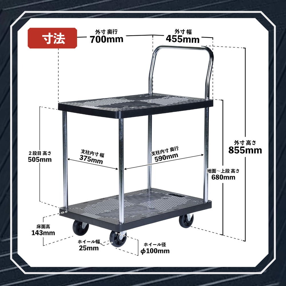 | サイズ | 外寸 : 幅465mm x 奥行720mm x 高さ860mm 積載面 : 幅370x奥行625mm ホイールサイズ : 直径約φ100mm |