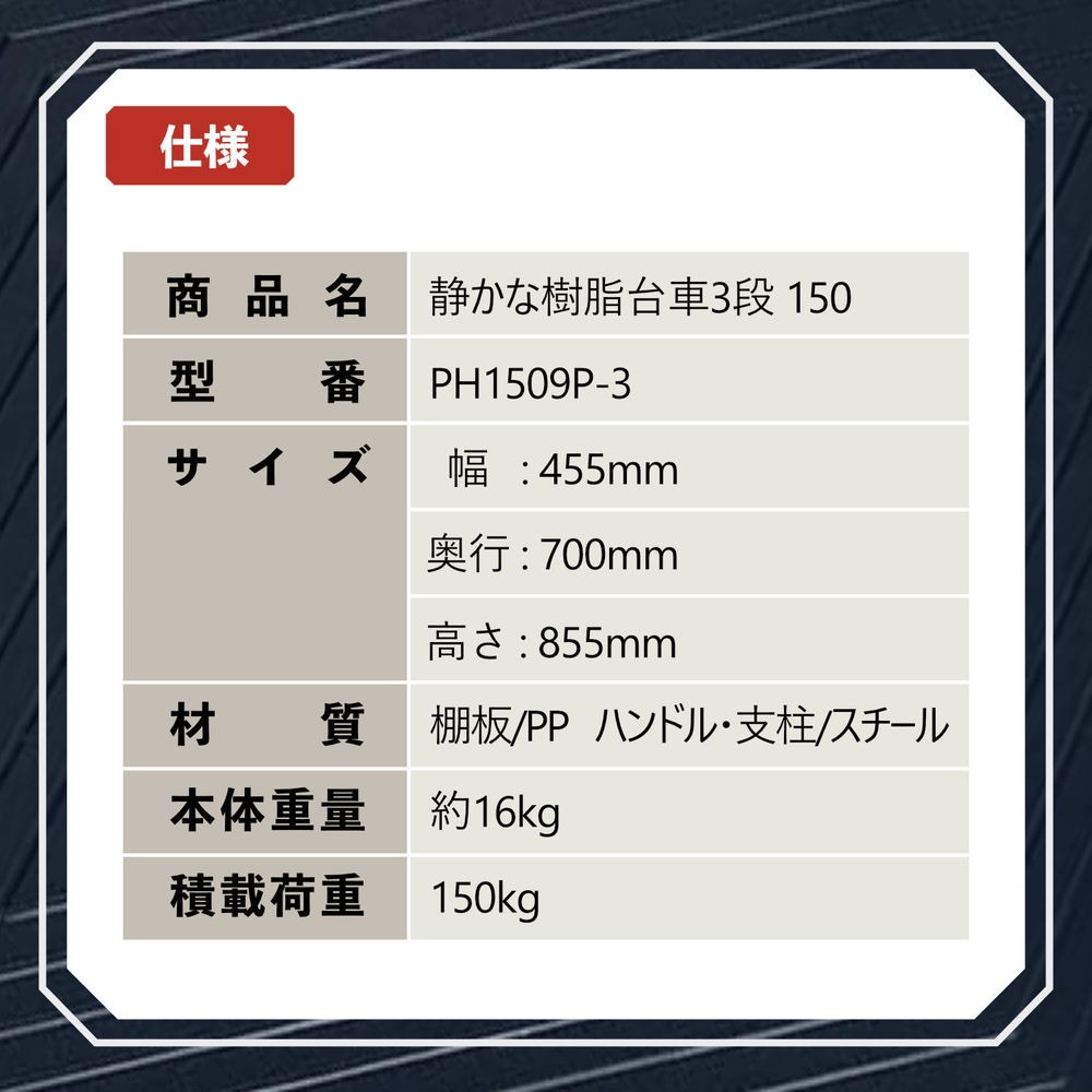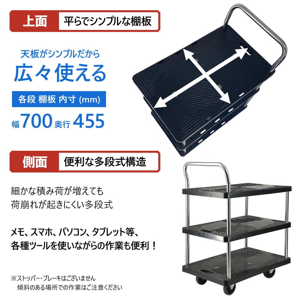 「3段式」の樹脂棚板を採用した積載荷重(耐荷重)150kgの多段式台車です。