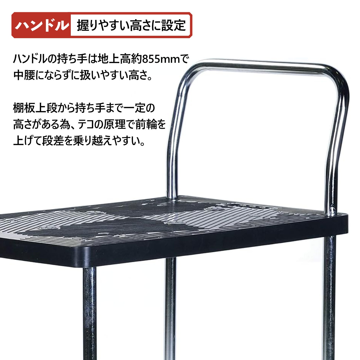 | サイズ | 外寸 : 幅455mm x 奥行700mm x 高さ855mm 積載面 : 幅455x奥行700mm ホイールサイズ : 直径約φ100mm |