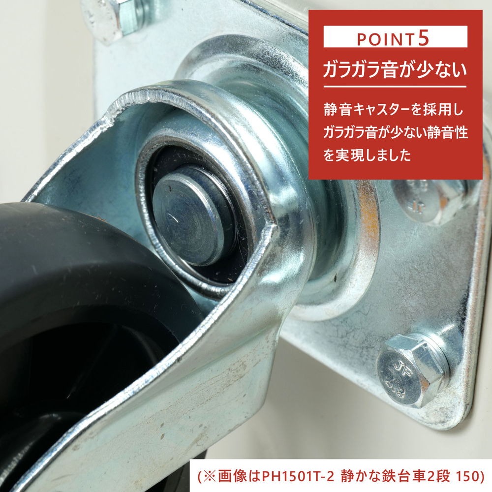 特殊ベアリングを採用し静音キャスターでガラガラ音を抑えました! ※床面の状態によって音がする場合があります。静音設計となっておりますが、完全な無音ではありません。