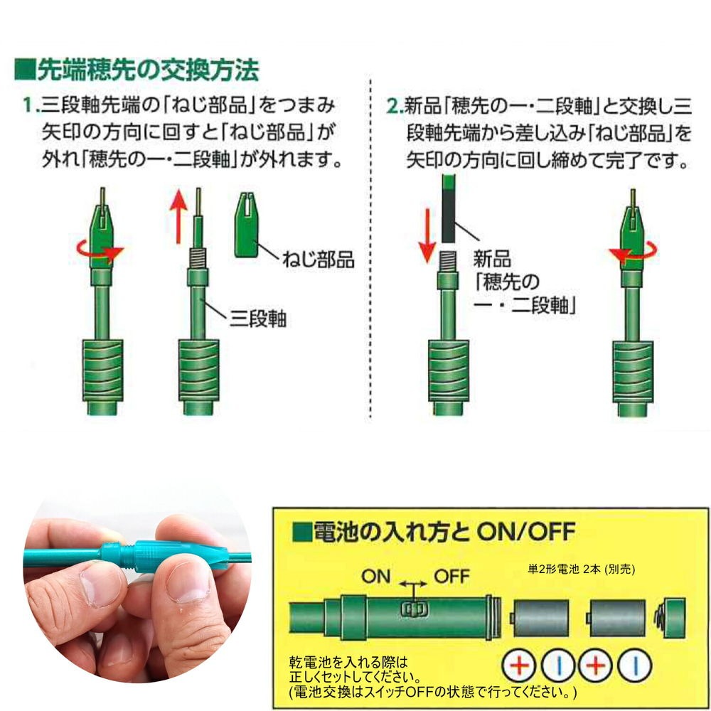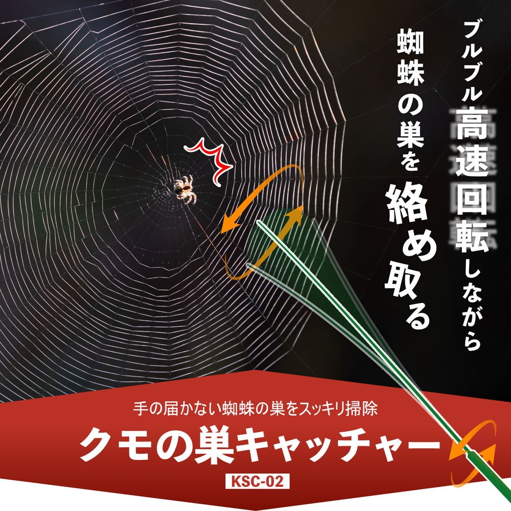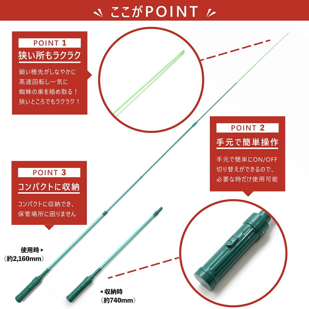 細くしなやかで穂先が電動でブルブル高速回転しながら蜘蛛の巣を一気に絡め取る! 狭い所の蜘蛛の巣も簡単に除去できます!