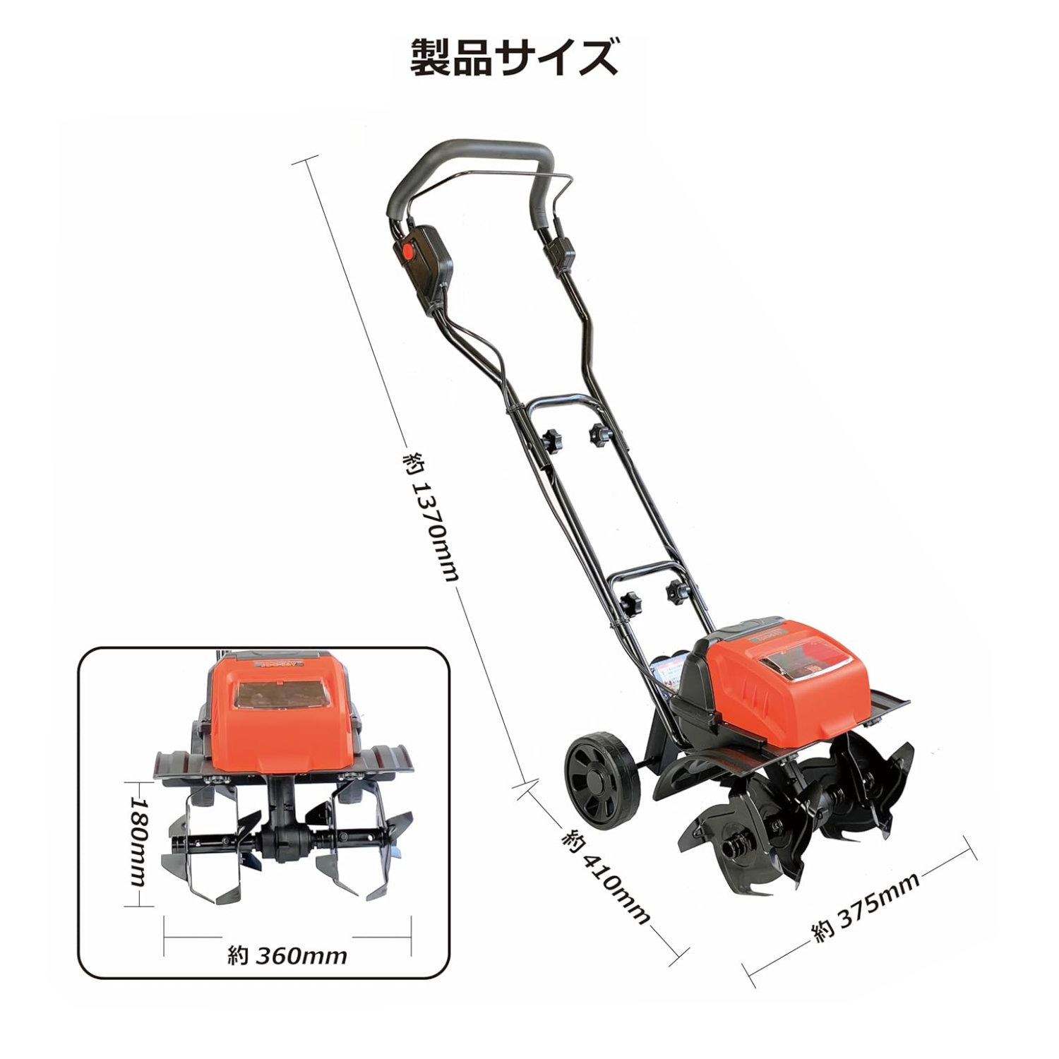 | サイズ | サイズ(約):幅375mm×奥行410×長さ1370 mm ・重量:約8Kg(本体のみ) ・耕うん幅(約):36cm ・耕うん刃の径:18cm ・無負荷回転数:約140 min-1 ・定格時間:30分 |