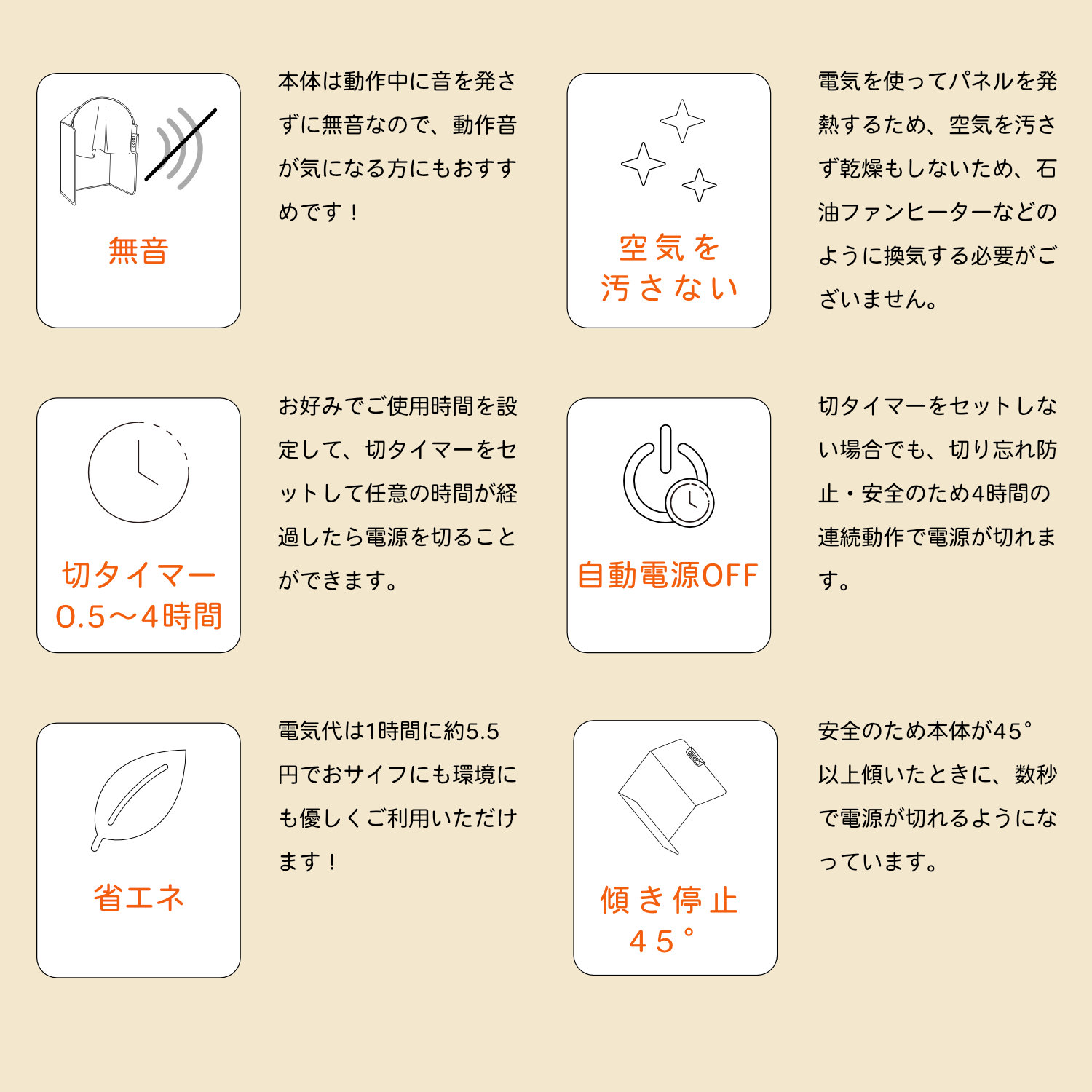 - 火災の防止: 転倒したパネルヒーターが、近くにあるカーテンや書類などに触れて火災につながるのを防ぎます。