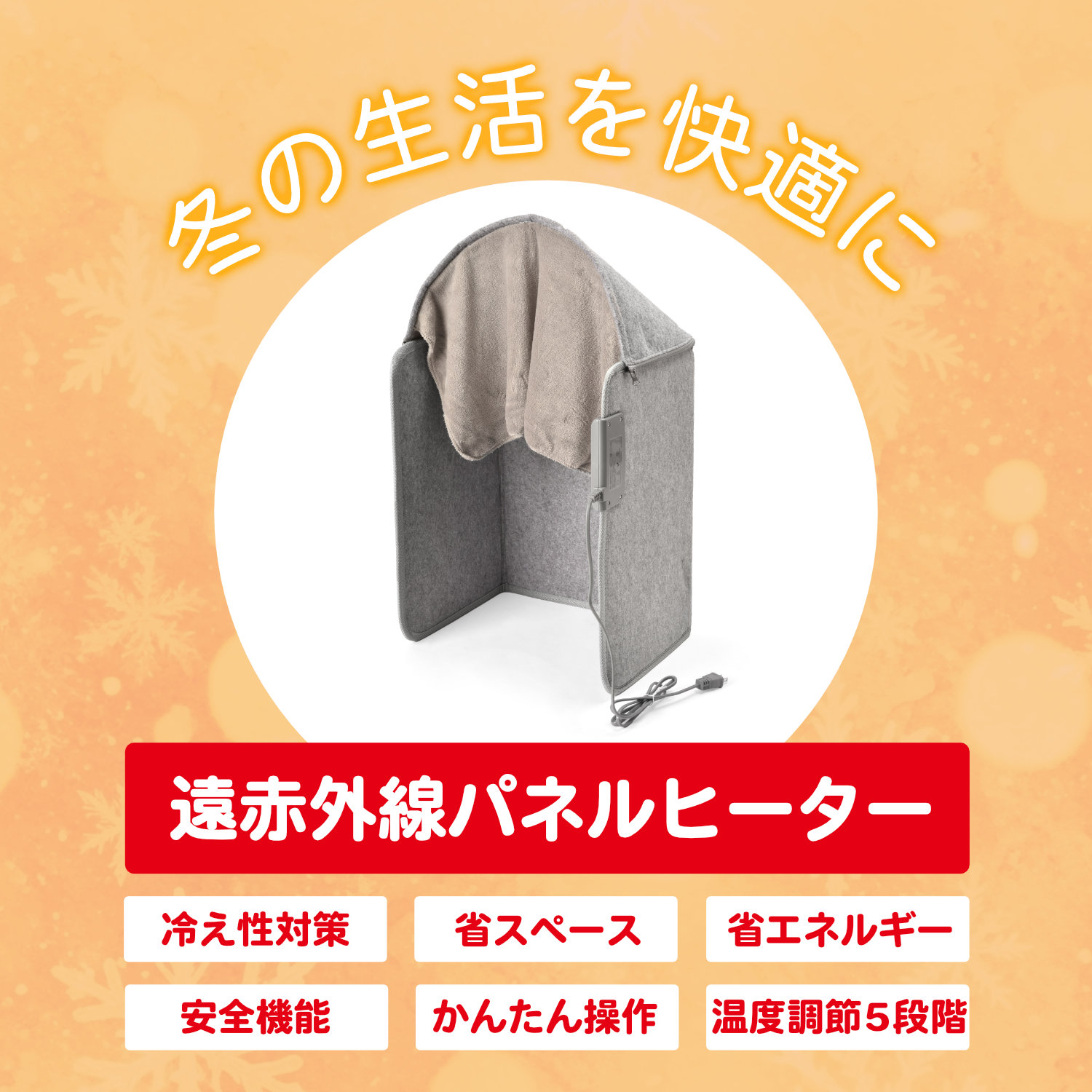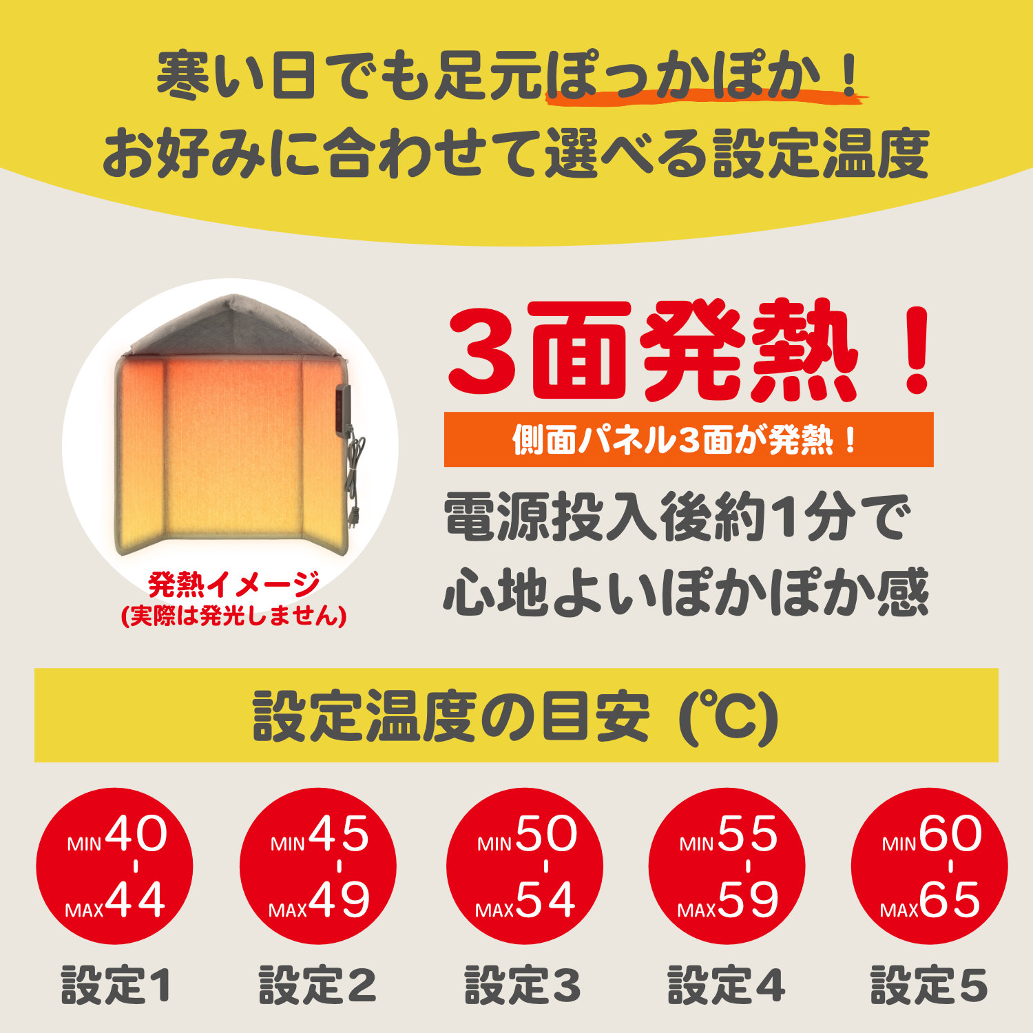 足元をやさしく囲う4面対応可能!熱源となる3枚のパネル(正面、左右)が遠赤外線を利用した輻射熱で足元をじんわりと温めます。
