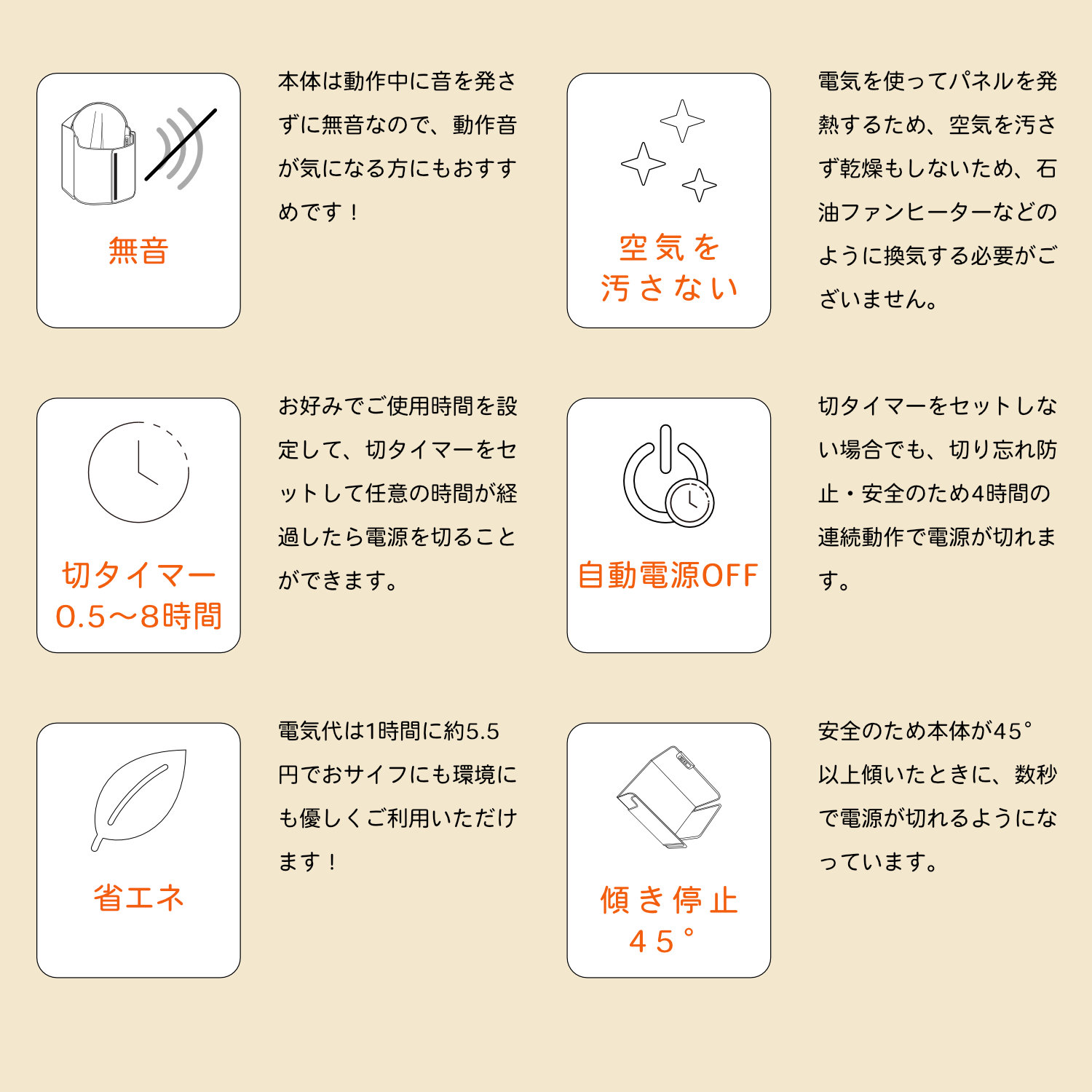 ヒーターが一定の角度(例えば45度)以上傾いたり、完全に倒れたりした場合に、内蔵されたセンサーが感知し、自動で電源をオフにします。この機能により、火災の防止、パネルが高温のまま放置されることによる火傷のリスク低減、ペットや子どもがいる家庭での安心につながります。