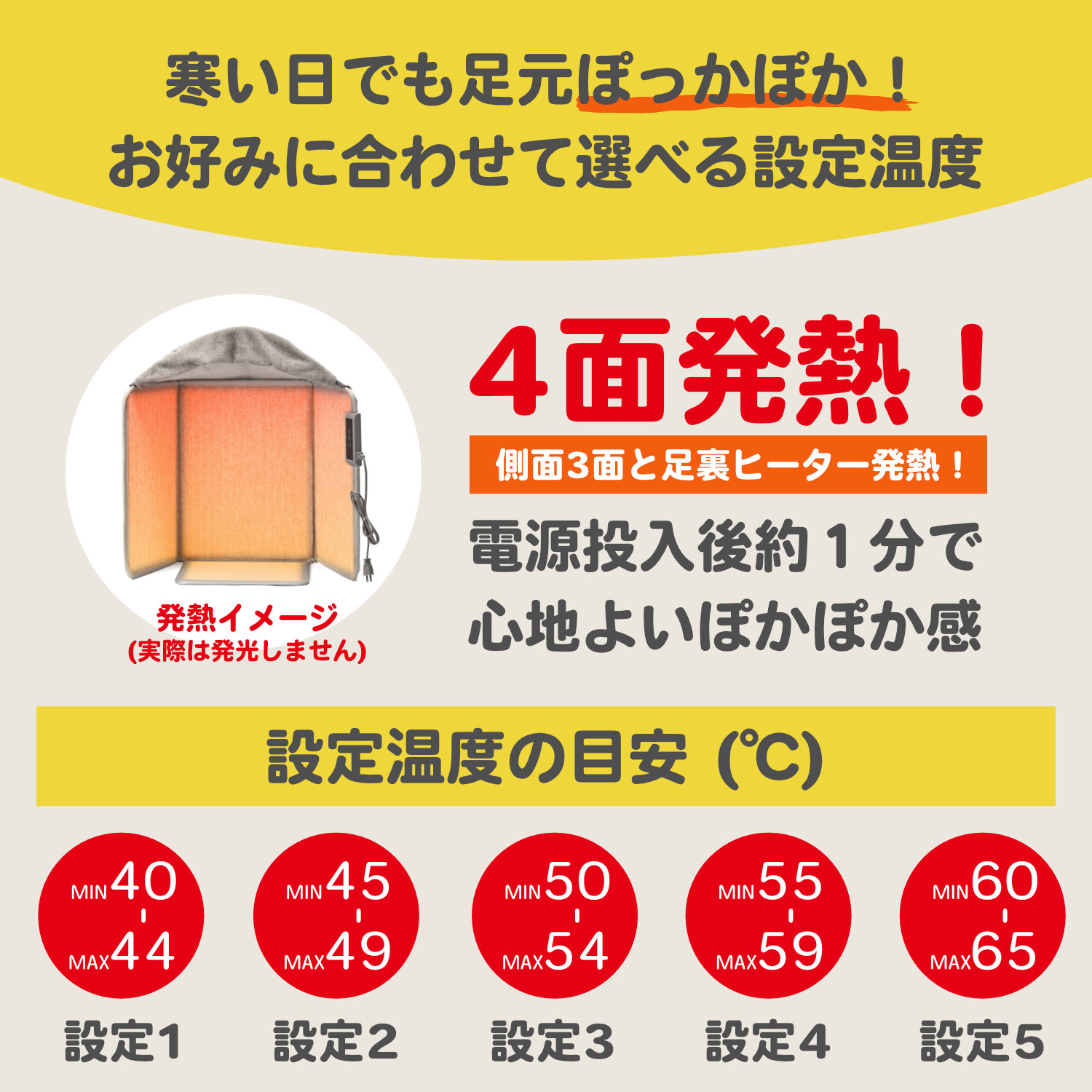 足元をまるっと囲う6面対応可能!(天面パネル・前囲い使用時)熱源となる4枚のパネル(側面3面、足裏1面)が遠赤外線を利用した輻射熱で足元をじんわりと温めます。