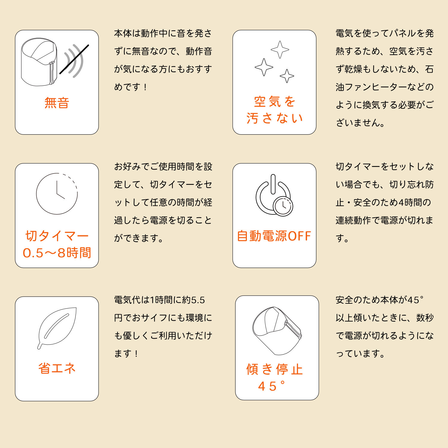ヒーターが一定の角度(例えば45度)以上傾いたり、完全に倒れたりした場合に、内蔵されたセンサーが感知し、自動で電源をオフにします。この機能があることで、火災の防止、火傷の防止、ペットや子どもがいる家庭での安心など、様々なリスクを減らすことができます。