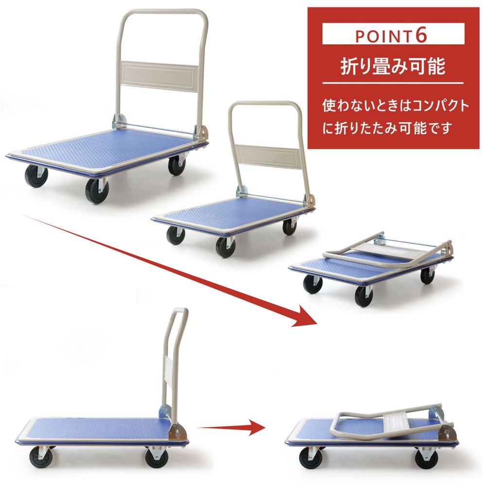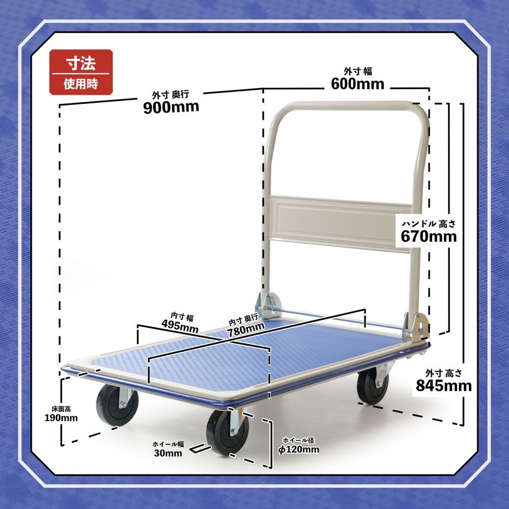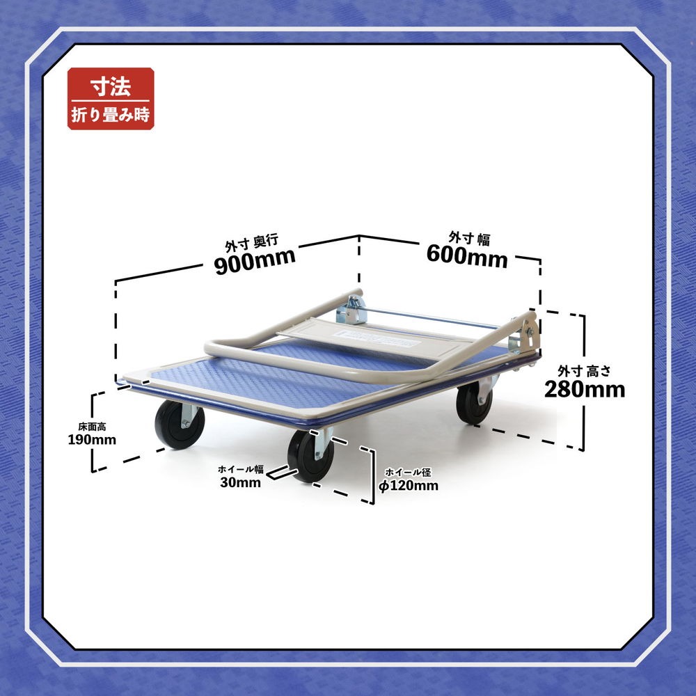 | サイズ | 外寸(使用時) : 幅600×奥行900×高845mm 外寸(折りたたみ時) : 幅600×奥行900×高280mm 積載面 : 幅495x奥行780mm ホイールサイズ : 直径約φ120mm 幅約30mm |
