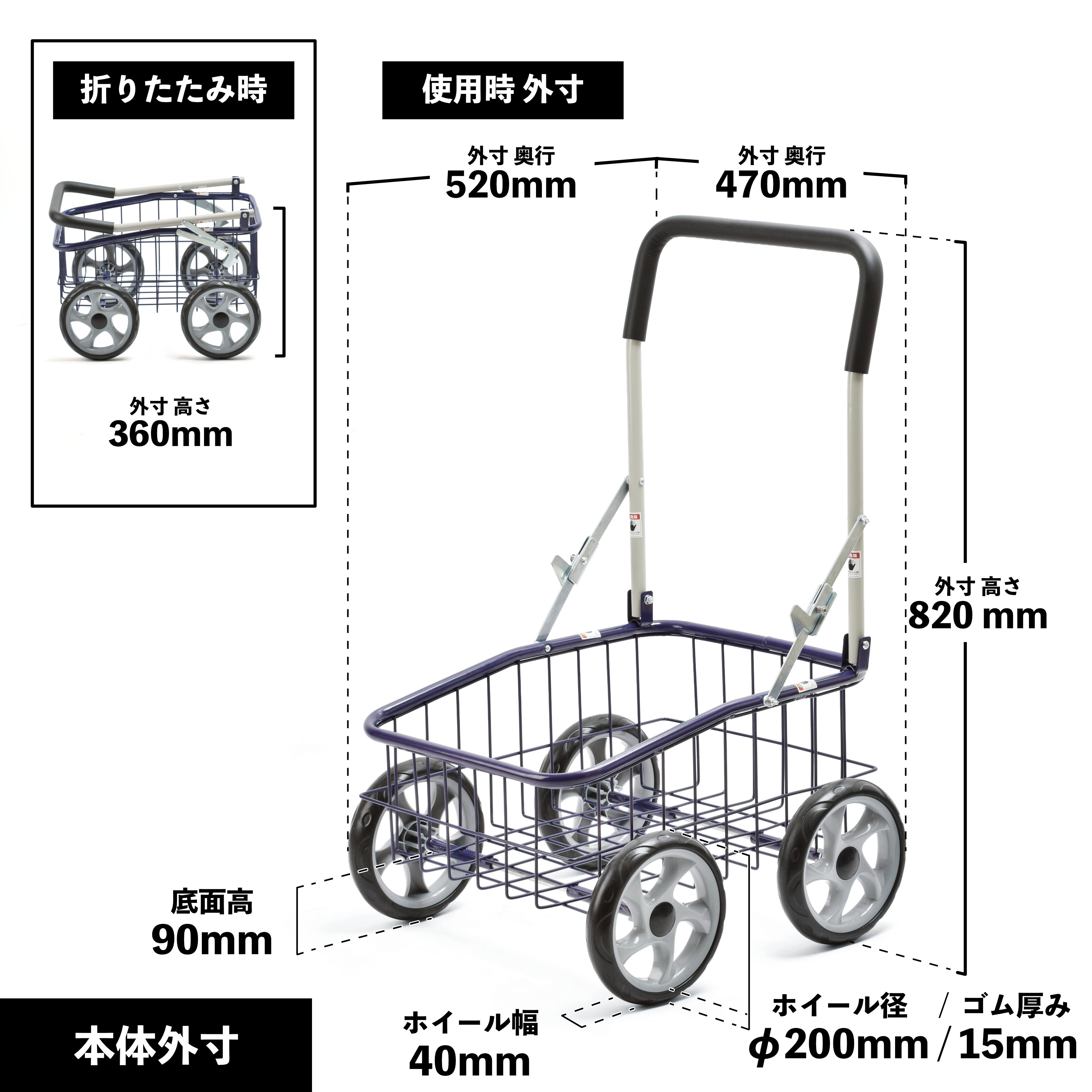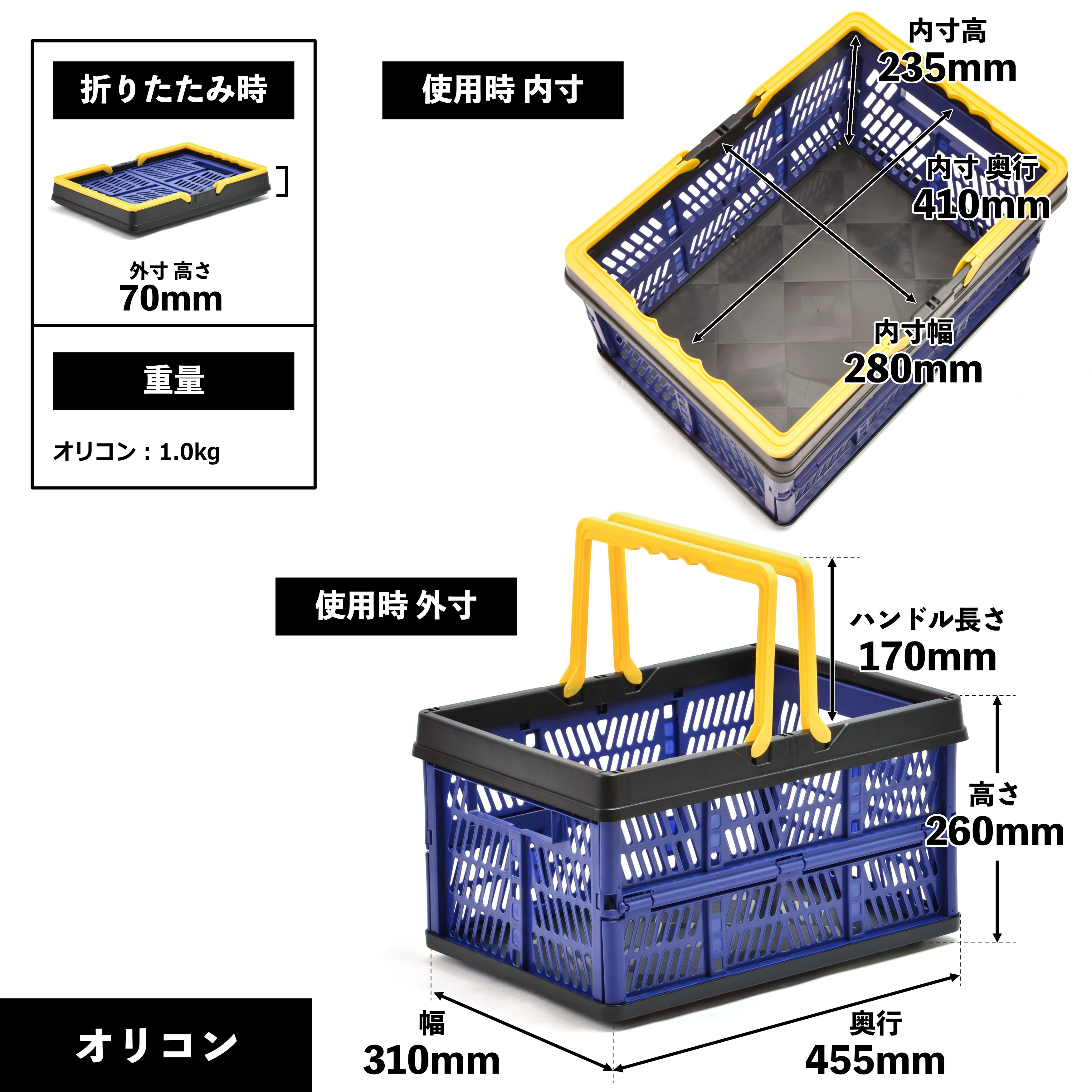 | サイズ | [本体] 使用時 : 幅470×奥行520×高820 mm 折りたたみ時 : 幅470×奥行520×高360 mm [バスケット(かご)] 使用時 : 幅310×奥行455×高260 mm 折りたたみ時/幅310×奥行455×高さ260 mm [内寸] 本体(かご部) : 幅350×奥行485×高205 mm オリコン : 幅280×奥行410×高235 mm |
