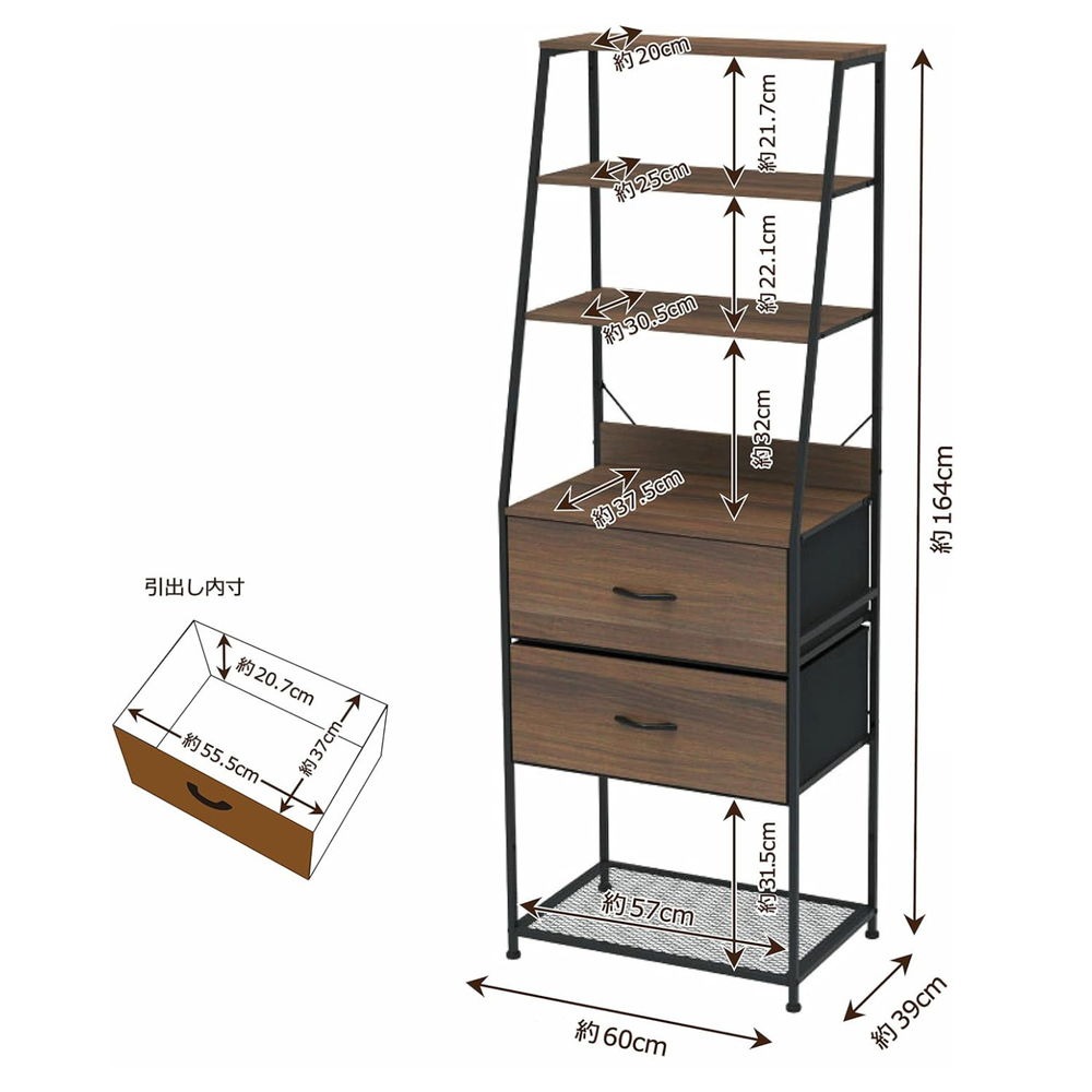 | サイズ | 製品サイズ(約) : 幅60×奥行39×高さ164 cm 引出し内寸サイズ(約) : [大] 幅55.5×奥行37×深さ20.7 cm ×2杯 |